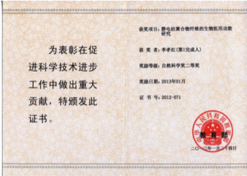 This achievement belongs to the field of biomedical materials.Electrospin a technique of the polymer solution or melt being spinningunder the high pressure electrostatic field.Currently, electrospuntechnology is a better approach to obtain nano-scale filaments.In recent years, the systematic investigation for the properties of the polymerelectrospun fibers and basic scientific issues of the realization of biomedical functions were launched, which funded by the National Natural Science Foundation Project.