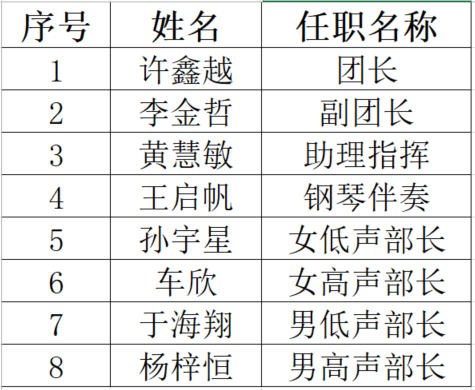团员们都积极的报名合适的职位,在许欢老师的组织以及团员们的配合下,本次换届会议顺利举行,完成了合唱团的新一届干部选拔工作,同时也制定了下学期合唱团的训练计划。下图为新一届任职名单: