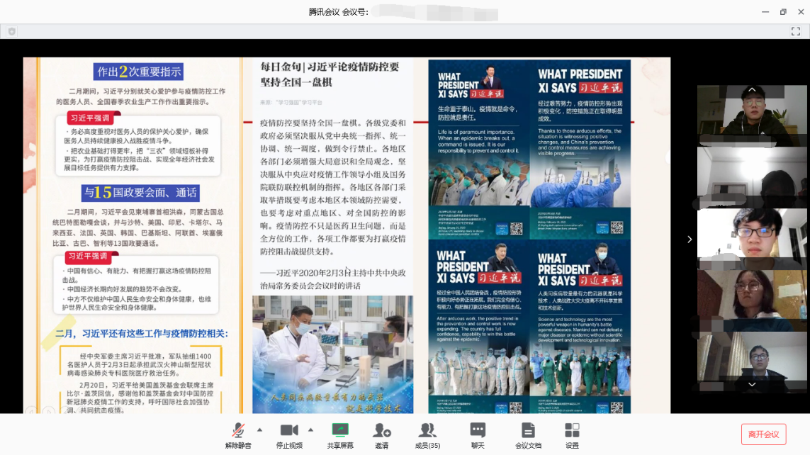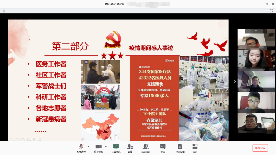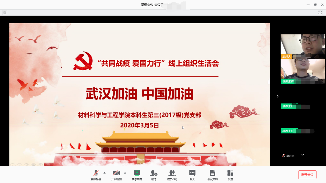 2020352015,本科生第三(2017)党支部的全体党员和部分积极分子借助腾讯会议软件,以视频的形式开展了以“共同战疫,爱国力行”为主题的线上组织生活会。本次会议主要以学习研讨分享的形式展开,会议由支部书记黄德明同志主持。