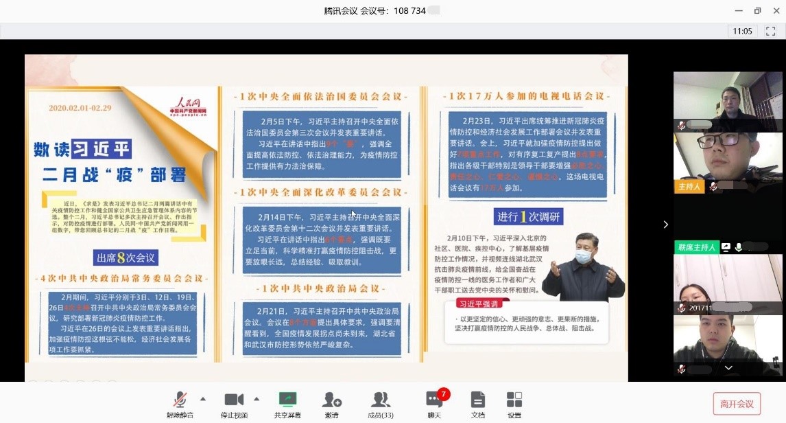 会议开始,黄德明同志先带领大家学习习近平总书记关于新冠肺炎疫情防控工作系列重要讲话精神,及党中央发布的关于新冠肺炎疫情防控工作的最新规章制度。从二月战“疫”部署中,大家深刻体会到了中央对疫情快速、有力的反应,并再次感受到了“四个自信”的深刻内涵,从而更坚信在党的带领下我们有信心、有能力打赢这场疫情防控阻击战。随后,章春军同志向同志们通报了当前校园防控的一些部署要求和公司师生总体健康情况,并结合相关实例提醒党员同志们担起责任,及时反映自身、周围人的健康情况,及时动员同学们填报每日健康信息,及时反映生活上、网课学习中的问题,做好师生间的桥梁作用。此外,他还要求党员们做好网络宣传,关注网络舆情动态走向,并期望大家在返校前的这段时间里能够收集一些“战疫”相关的宣传教育素材。