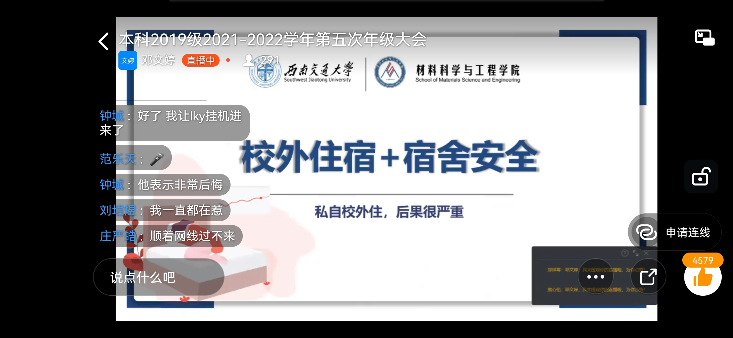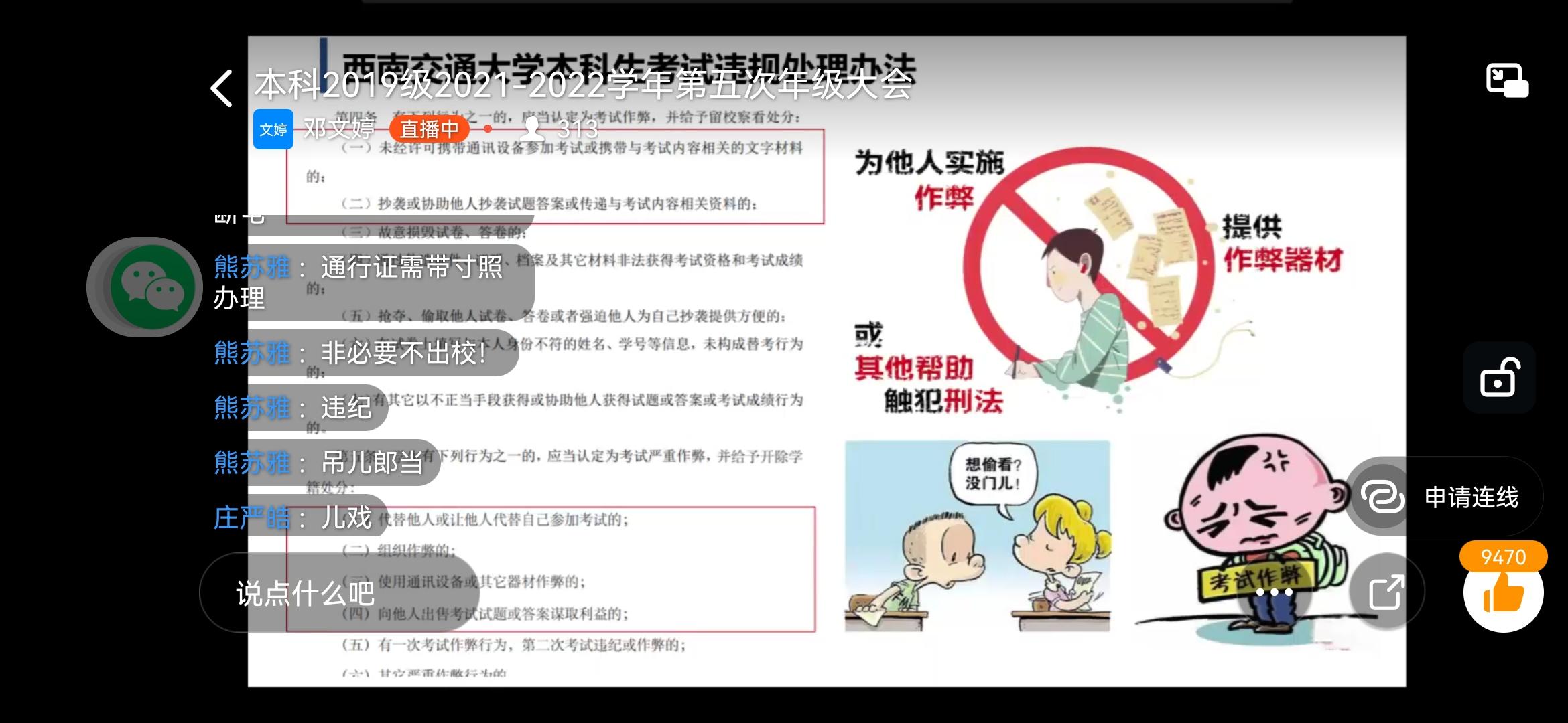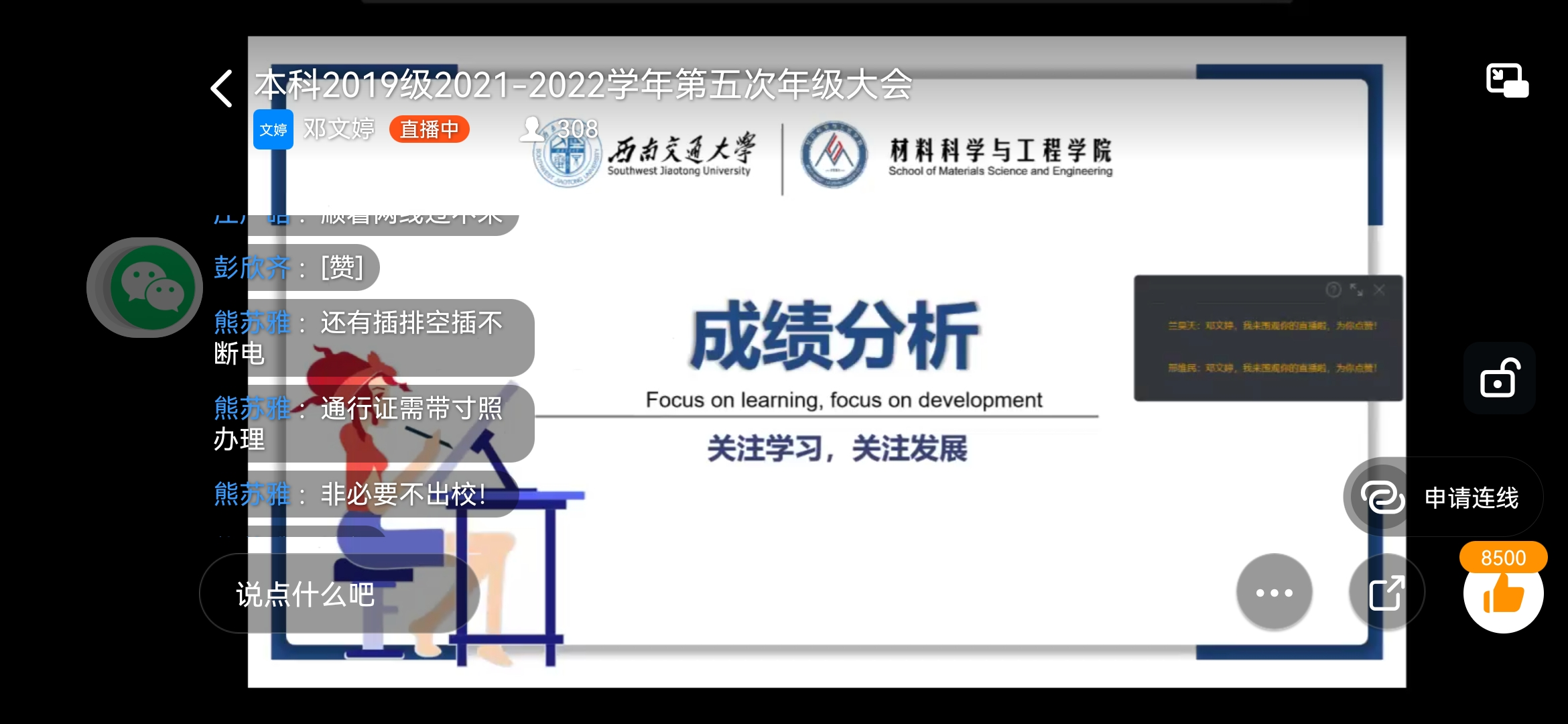 最后,熊苏雅再次强调疫情防控事宜,同时提醒同学们关注公司通知以及课程教师的安排,也不要因为“上网课”而懈怠。在邓文婷解答了一些同学们的疑问之后,本次大会圆满结束。