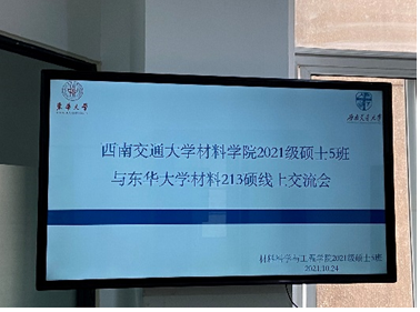 为了搭建开放的学术交流平台,营造浓厚的学术氛围,拓展宽阔的知识视野,提升研究生的创新能力和学术交流能力,互学互鉴,取长补短,2021年10月24日上午9:00,bevictor伟德官网2021级硕士5班与东华大学材料213硕举行了交流会。此次交流会,由2021级硕士5班牵头举行,郑学超同学主持,采取线上及线下相结合的方式开展。