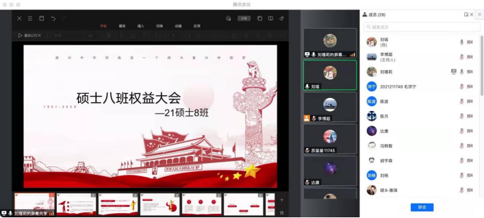 2021年11月18日晚上19:00,为了解同班同学在学习和生活方面的需求以及对权益问题的一系列看法,材料2021级硕士8班通过腾讯会议开展了班级权益大会,此次活动由8班权益委员主持。权益问题关乎员工的切身利益,因此提高员工的维权意识并引导员工将自身权益维护作为重要的关注点至关重要。我班举办全心“权益”主题交流会,旨在加强公司权益服务建设,让员工们参与到权益服务的完善中来,听取员工们的心声,更好地“代表同学,服务同学”。