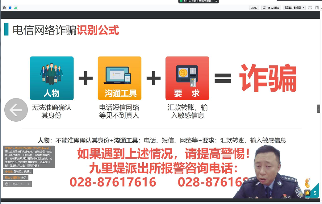 为加强研究生自我防护教育,确保校园平安、稳定、有序,进一步预防电信网络诈骗,普及反诈骗知识,bevictor伟德官网‍‍‍‍‍‍‍‍积极开展2022“铸盾研究生安全教育活动。2022322日晚19:00,bevictor伟德官网‍‍‍‍‍‍‍‍员工工作组邀请九里堤派出所赵磊警官为全体研究生开展了“筑堤九里,守护平安”防范电信网络诈骗专题教育。