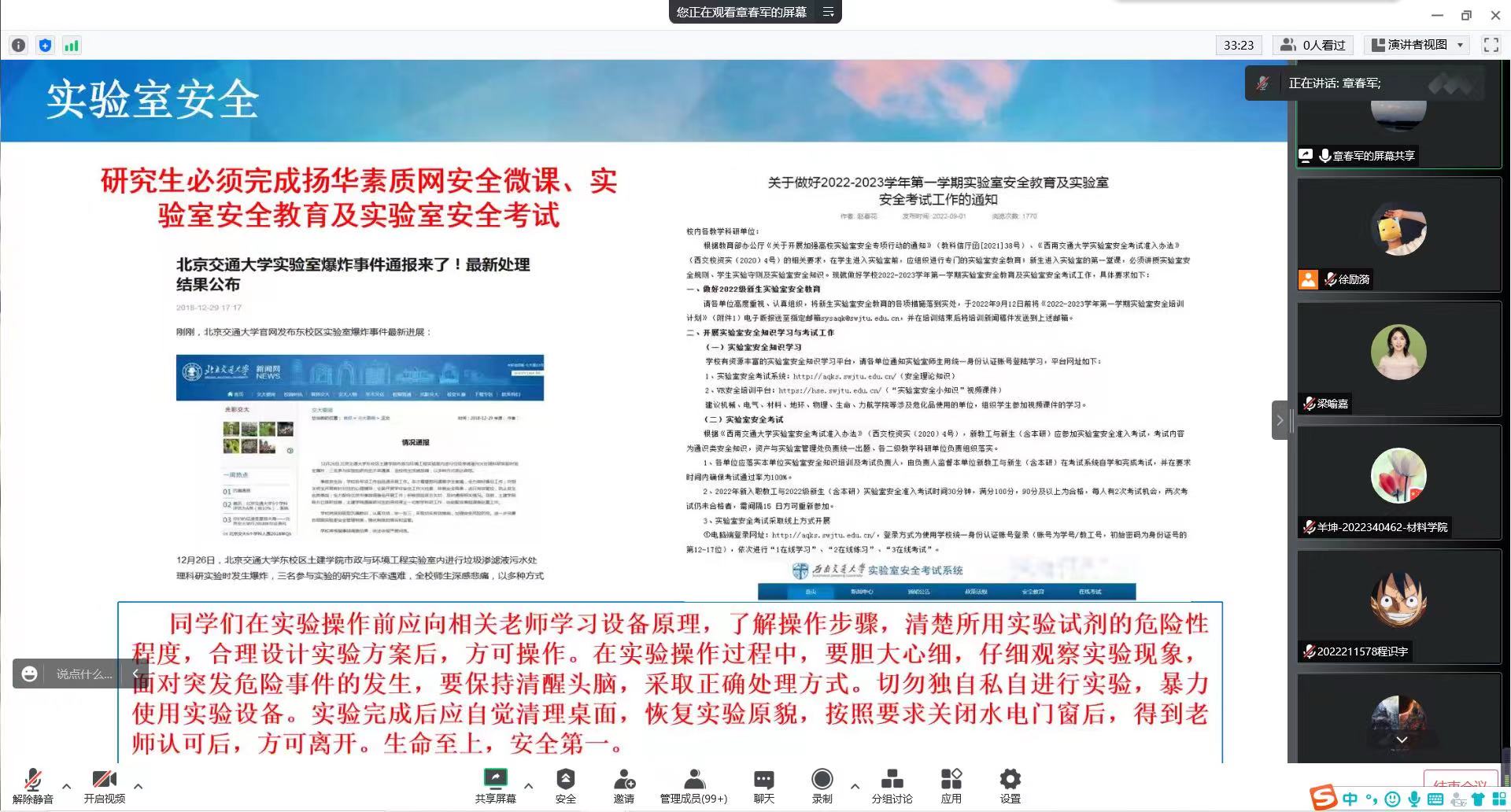 针对研究生学习科研工作必须开展大量实验工作的现状,章春军强调同学们要特别重视实验室安全工作,他通过讲解实验安全警示案例,引导同学们树立安全底线意识、规范操作意识,告诫每一位研究生必须掌握实验安全技能、养成良好的安全工作习惯,坚决守好实验室安全工作这条红线。