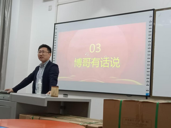 最后,班主任胡博老师就本次班会提出了一个让同学们深思的问题:“为什么我们要反复学习党的二十大精神?”,秦路洲同学对此说出了自己的感想:“我们身处两个百年交际的时代,世界百年未有之大变局中,二十大是对上一个百年党的道路和成就的总结和反思,同时也是对下一个百年的规划与展望,我们当代青年也将成为党和国家的中流砥柱,肩负时代的责任,当然这也意味着更多的机遇,青年一代在这样的时代应当更有信心追逐理想,我们也应紧跟党的领导和号召,实现个人价值,推动国家和社会的进步富强。”这是胡老师为同学们带来的意义重大的“开学第一课”,在胡老师的思想洗礼下,每一位同学都应思考自己的目标,规划老员工活,使其更加精彩,充满意义,不负大好时光,不负青春年华。