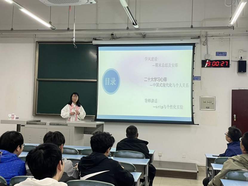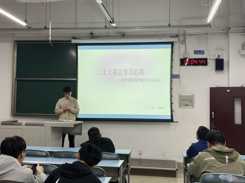 接着,为在学思践悟中深入领会党的二十大精神,争做新时代有为青年,团支书周鑫禄同学带领班级同学对党的二十大报告进行了学习,引领同学们学党史,感党恩,听党话,跟党走。并通过结合班级实际情况进行具体分析,激励同学们把爱国情、强国志、报国行融入日常的学习和生活当中,在实现中华民族伟大复兴中国梦的生动实践中放飞青春梦想。