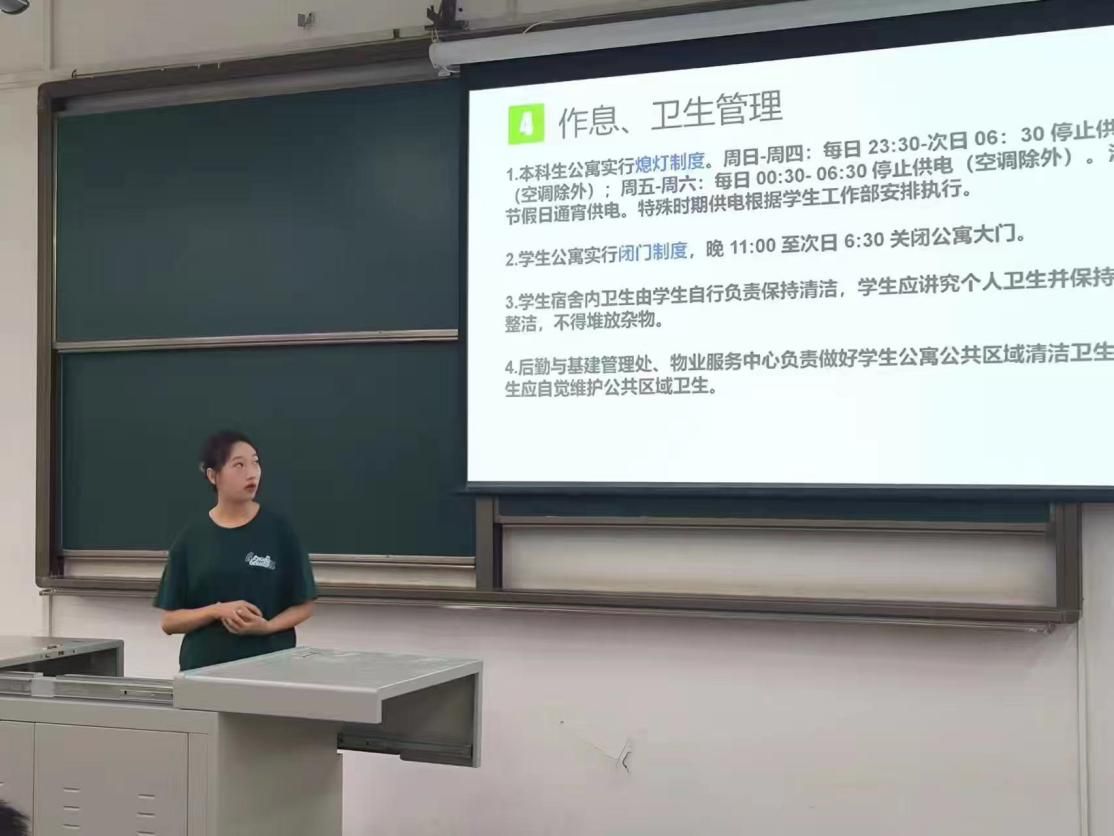 为规范员工管理,保障员工合法权益,将管理与育人相结合,培育优良校风学风,培养德智体美劳全面发展的社会主义建设者和接班人。同时为进一步强化新生安全意识,树牢底线思维、坚实筑牢员工校园安全防线,熟悉公司宿舍等相关管理制度。2023年9月21日下午,bevictor伟德官网本科2023级辅导员、公司青年讲师团成员熊心怡及公司青年讲师团成员、本科2023级年级助理向思林面向2023级新生开展年级大会暨新生入学安全教育。