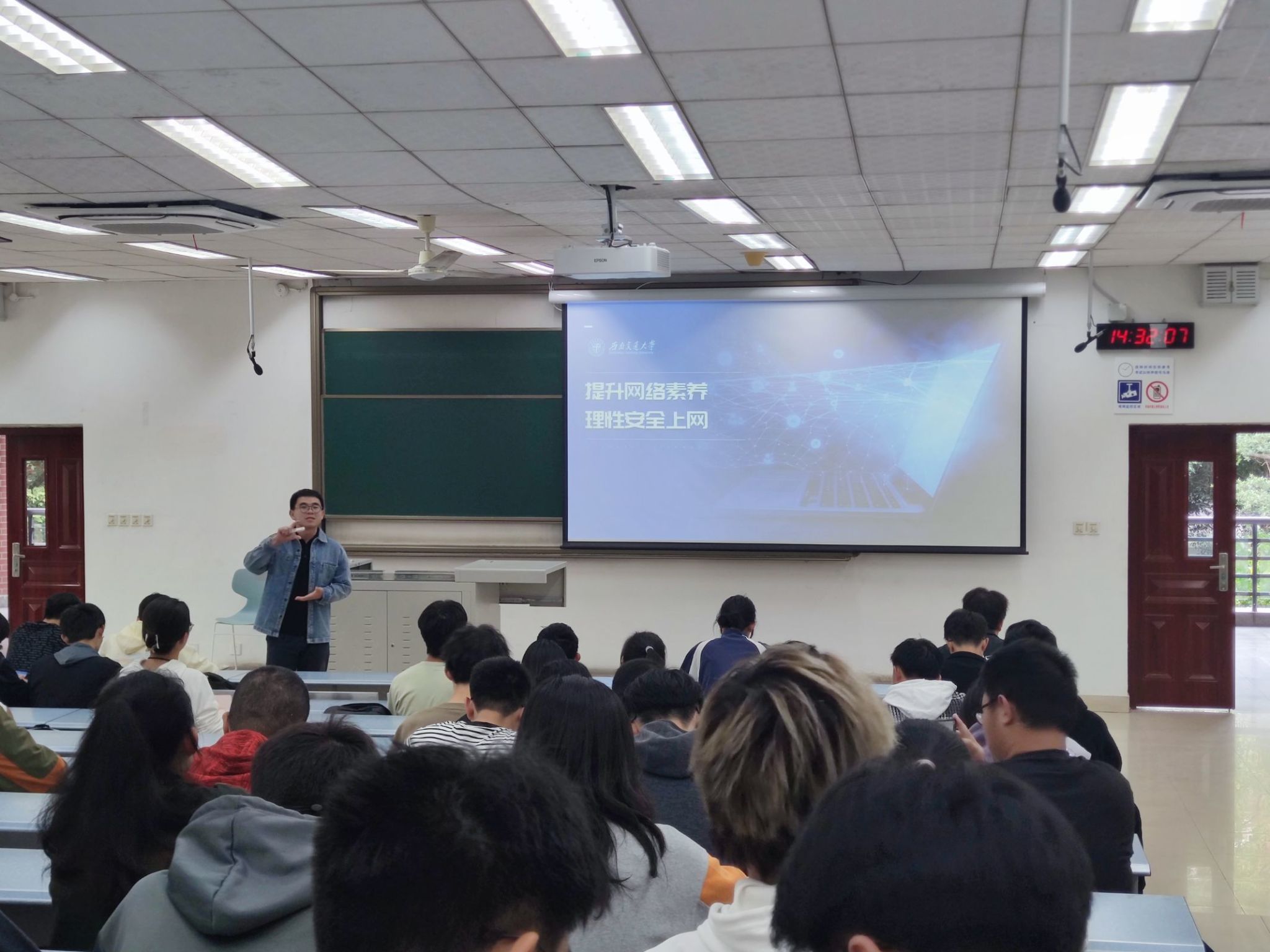 首先郑纪伟老师向同学们阐述了老员工应当具备的网络素养、网络安全基本常识、借助网络学习的能力以及文明上网的自觉性。为加深同学们对网络素养的了解,郑老师通过生动的案例导入,向同学们科普网络法律知识,告诉同学们在网络世界中要把握好尺度,做到有所为、有所不为。同时,郑老师提醒同学们要细心辨别和筛选有害信息,对于网络上出现的一些舆情舆论,需要擦亮眼睛、理性思考,不要人云亦云,更不能推波助澜。不断增强网络文明意识,提升网络文明素养,才能营造更加清朗的网络空间。
