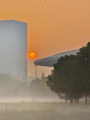 早八路上,惊喜发现橘红色的太阳被夹在三号教学楼和飞碟体育馆之间。美好的景象让人忘记早八的痛苦,反倒有些能看到如此美丽景色的激动。