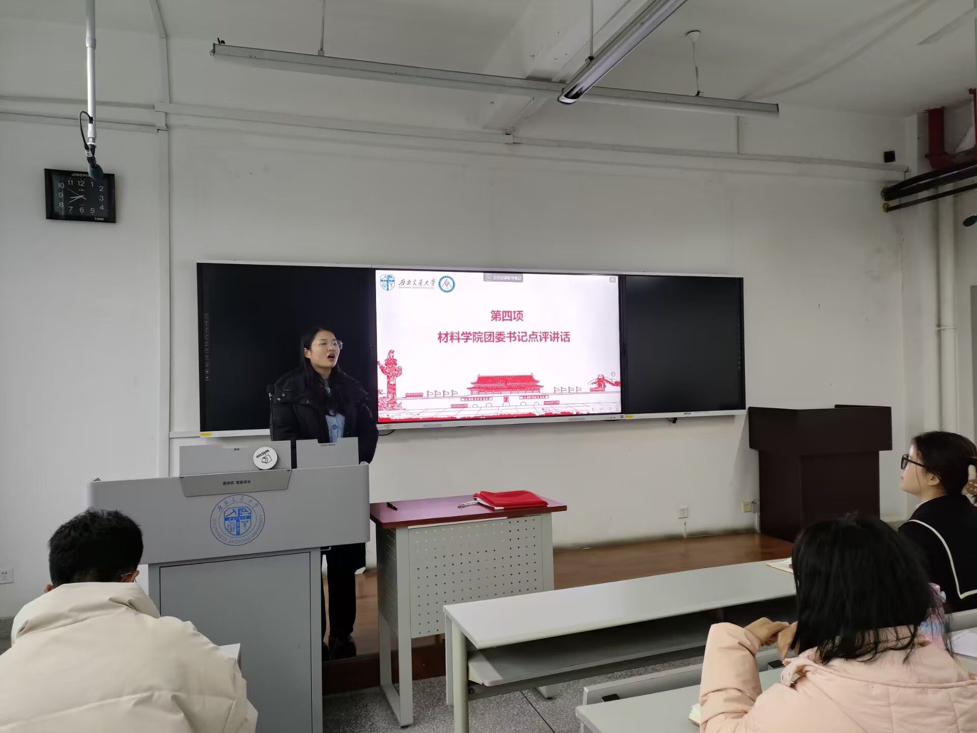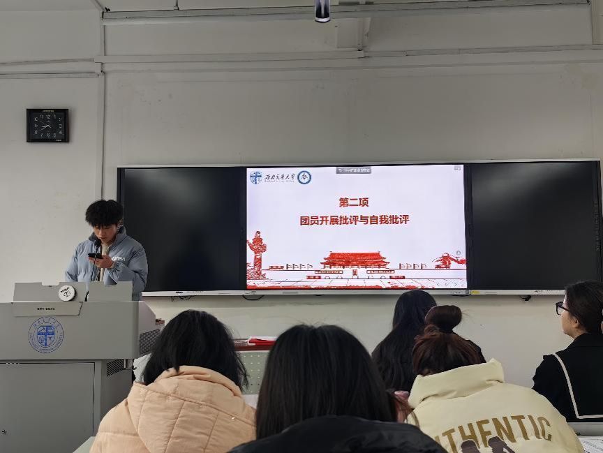 首先,团支部书记鞠浩鹏同学进行了工作汇报。他详细介绍了团支部本学期开展的团员和青年主题教育四个专题、青年大学习完成情况、主题团日活动等。而后,鞠浩鹏通报团支部委员会检查团支部和团员后存在的不足等情况。他的汇报得到了全体团员的肯定和支持。