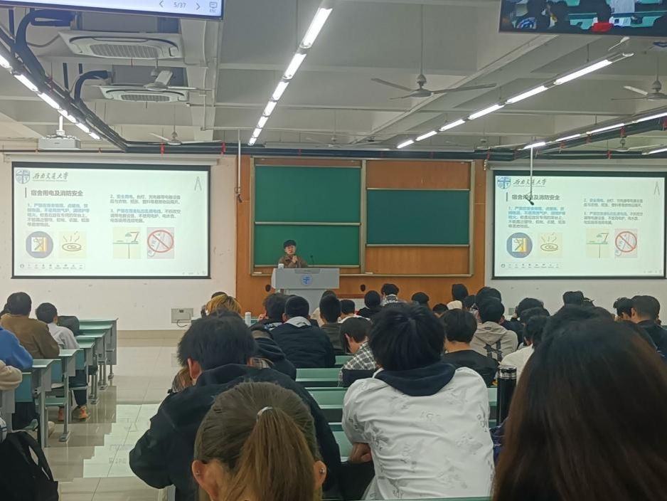 第二部分,年级助理张岩松学长为同学们讲解宿舍安全问题。张岩松首先带领同学们学习《员工公寓管理办法》,分享了近期发生在员工宿舍的消防安全实例,再次强调严禁在宿舍吸烟、点燃明火、安全用电、严禁私拉乱接电线,及时清理宿舍的废旧纸张、衣物、塑料等可燃杂物。随后讲解了关于规范校内电动车停放及充电的通告以及电动车安全使用指南。