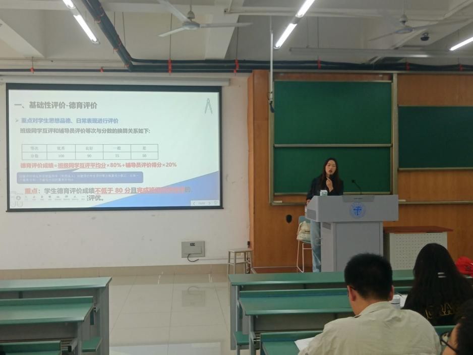 第三部分,年级助理向思林学姐带领同学们学习《韦德官方网站本科生综合素质评价办法》。综合成绩由基础性评价和发展性评价构成,其中基础性评价包括德育评价、智育评价、体育评价、美育评价和劳育评价,发展性评价包含员工干部加分、科创竞赛加分等。综合素质评价排名关乎评奖评优,向思林学姐鼓励大家努力学习,认真做好学业规划,以优异的成绩来为自己的老员工活争光添彩。