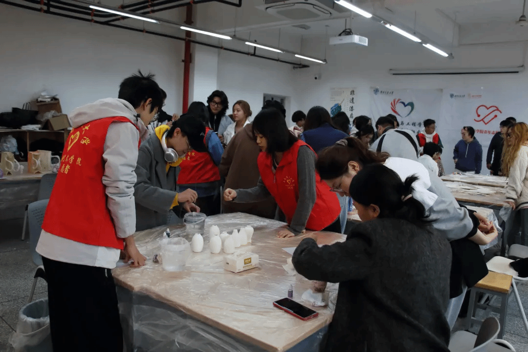 活动开始前,志愿者们分工明确,井井有条地进行现场布置。活动开始,现场人头攒动,参与者井然有序地排成队伍,领取空白扇。在志愿者的介绍下,大家了解了漆扇的历史背景、文化内涵及价值意义,通过现场展示的漆扇制作技艺,近距离感受到了传统工艺的独特魅力。随后,在志愿者的指导下,参与者们纷纷开启了他们的漆扇制作之旅,大家精心挑选好自己喜欢的颜色,在志愿者的帮助下,小心翼翼地将彩漆放入颜料桶中,并用小棍子轻轻搅动。通过不同的旋转角度和摆动方式制作属于自己的,独一无二图案,很快一把把绚丽多彩的漆扇就呈现在眼前,大家纷纷展示着自己的作品,脸上洋溢着喜悦的笑容。除了漆扇制作现场还有扭扭棒制作,素胚瓷瓶的描画等供大家选择。