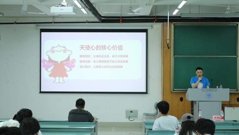 赖中勇以生动的讲解结合“爱奇儿”与志愿者活动的影视资料,详细介绍了成都天使心的服务理念、工作内容、服务项目等内容。通过与现场师生的积极互动,赖中勇深入浅出地阐释什么是“爱奇儿”、“天使心”的内涵以及天使心活动的重要意义,呼吁同学们给予“爱奇儿”家庭更多关爱与包容,鼓励同学们加入志愿服务行列。
