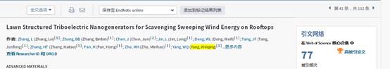 公司博士研究生张磊和张彬彬以及美国斯坦福大学陈俊博士于2016年4月在《Advanced Materials》(影响因子:21.950)上发表的第一作者论文“Lawn Structured Triboelectric Nanogenerators for Scavenging Sweeping Wind Energy on Rooftps”入选ESI“高被引论文”。