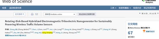 公司博士研究生张彬彬和美国斯坦福大学陈俊博士于2016年7月在《ACS Nano》(影响因子:13.709)上发表的第一作者论文“Rotating-Disk-Based Hybridized Electromagnetic-Triboelectric Nanogenerator for Sustainably Pwering wireless Traffic Volume Sensors”入选ESI“高被引论文”。