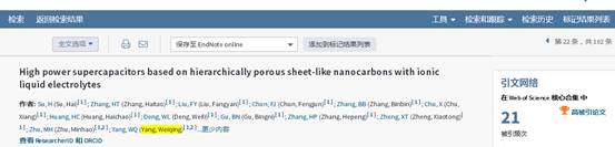 根据美国科技信息所(ISI)基本科学指标数据库(ESI)最新数据显示,公司杨维清团队硕士研究生苏海(通讯作者:张海涛和杨维清)于2017年8月在《CHEMICAL ENGINEERING JOURNAL》(影响因子:6.735)上发表的第一作者论文“High power supercapacitors based on hierarchically porous sheet-like nanocarbons with ionic liquid electrolytes”入选ESI“高被引论文”。(注:该论文在2018年三月入选“热点论文”)