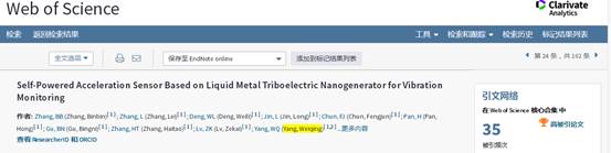 公司博士研究生张彬彬和张磊于2017年7月在《ACS Nano》(影响因子:13.709)上发表的第一作者论文“Self-powered Acceleration Sensor Based on Liquid Metal Triboelectric Nanogenerator for Vibration Monitoring”入选ESI“高被引论文”。