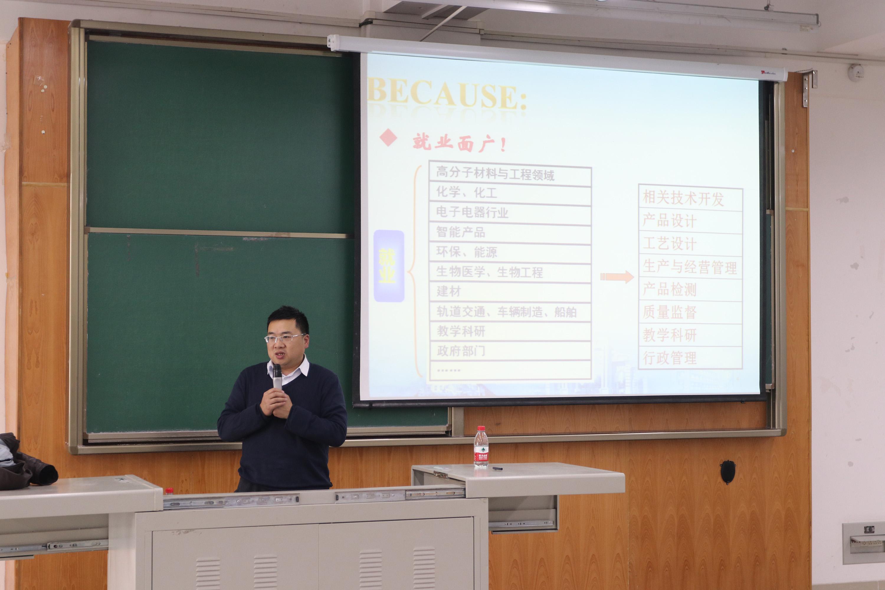 接着,王勇老师讲解了高分子专业在本科生培养和研究生方面的优势,比如有较高的保研、考研比例,员工们出国留学也比较方便,同时也很适合自主创业。这些实际的好处更引起同学们的思考,使大家对高分子有了更多了解。
