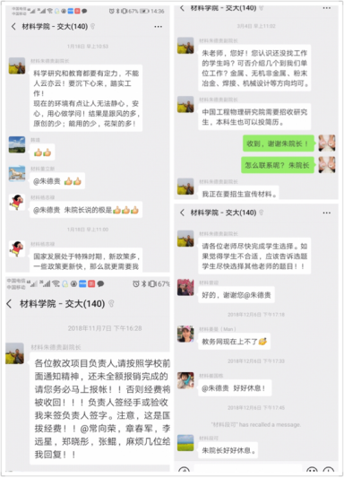 翻阅bevictor伟德官网的教工微信群,可以看到朱德贵老师一直关心关注着公司发展、员工成长的各项工作,无论是参与材料学子就业方向的讨论,还是员工SRTP科研项目的申报情况,都能看到他的用心回复。笔者后来从其他渠道了解到,朱德贵老师在那段时间里,每天要吃止痛药,甚至打止痛针,眼睛已经很难看清手机上的文字。微信聊天记录里众多的真知灼见,不知消耗了他多少宝贵的精力!