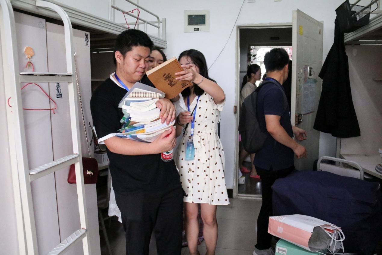 本次宿舍倒迁分四批次进行。上午8点,2018级辅导员梁喻嘉、黄静瑶到达天佑斋17号楼,罗丹到达15号楼,走访第一批搬迁的同学,并提醒同学们尽快收拾自己的物品,进行第一批搬迁。同时,辅导员黄德明、许欢、王誉静、周媛媛也进入寝室,为员工们提供帮助。