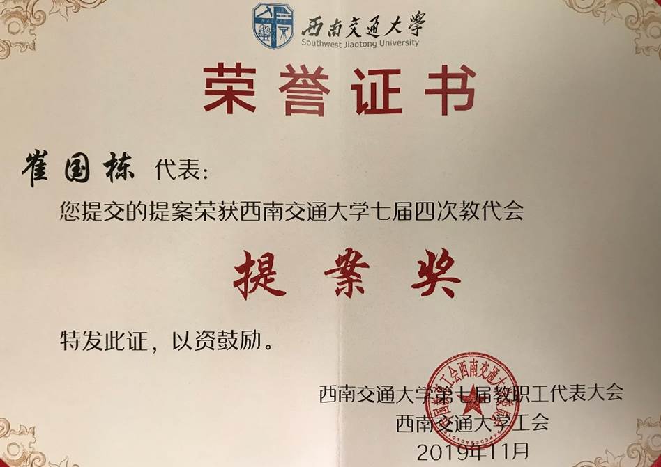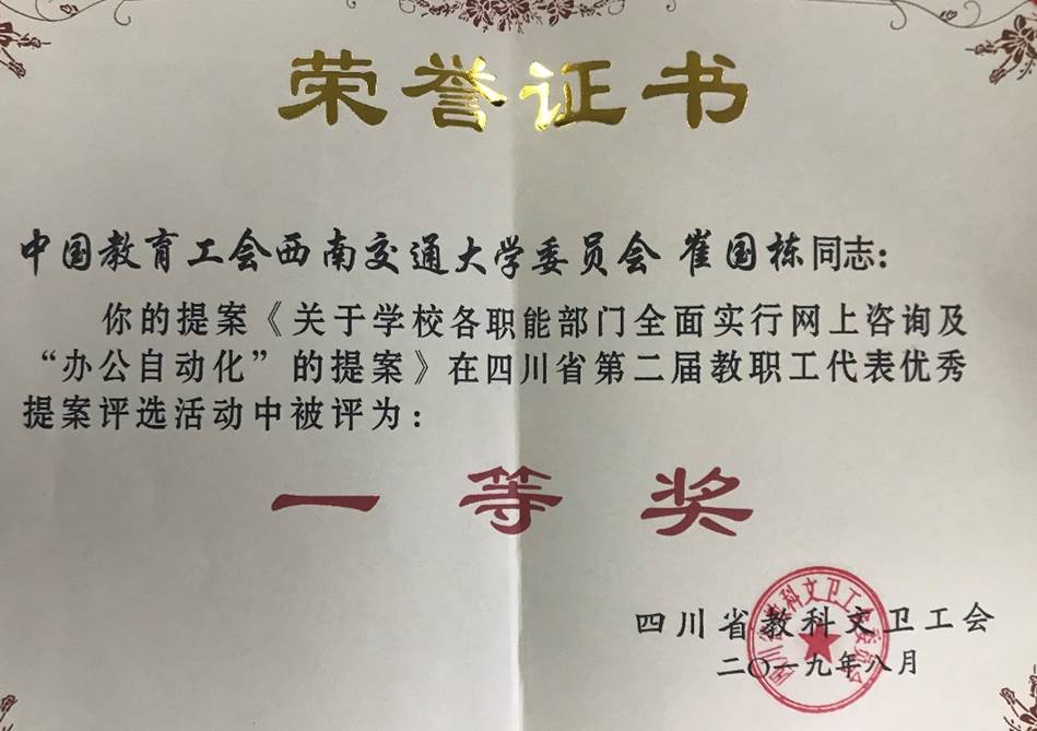 bevictor伟德官网崔国栋老师系公司实验室教师,高级工程师。自2010年开始,崔老师连续被选为公司第六届、第七届教代会代表。在任职教代会代表期间,崔老师尽职尽责,积极与广大教职工交流、广泛征求意见和建议。多年来,他结合公司发展情况和自身工作经历,先后整理、撰写各类提案20多项,涵盖民生、管理、教学、校园环境整治等多个方面。他的提案多次获得“校优秀提案”称号,其中2016年提出的关于公司各职能部门全面实行网上咨询及“办公自动化”的提案在2019年四川省第二届教职工代表优秀提案评选活动中被评为“一等奖”。