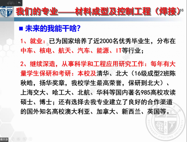 吕老师通过以上几个问题的解答,向同学们介绍了材料成型及控制专业的专特色。吕老师表示,焊接这一词大家其实非常熟悉,但是进入大学,同学们会发现焊接的世界非常广大。焊接是材料的“裁缝”,不光是金属,陶瓷、高分子、复合材料,甚至是人体软组织,几乎所有材料都可以“焊接”。在简单介绍完“什么是焊接?”后,吕老师又从未来规划、就业等与现实相关的,并且是同学们最为关心的方面,为同学们做了解答,解决了很多同学们所担心的问题,让他们对“焊接”这一技术有了更深一步的认识。