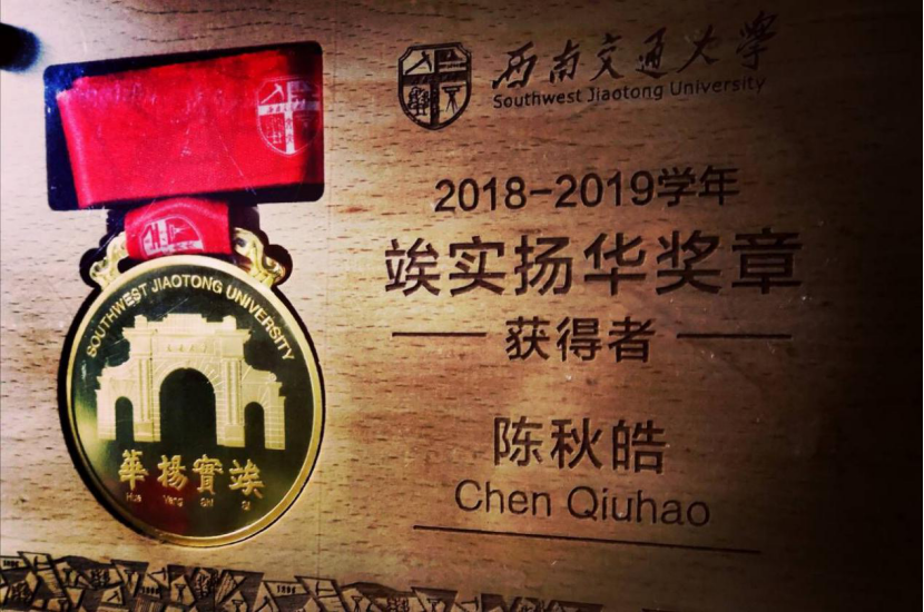 2019年11月,陈秋皓荣获了韦德官方网站“竢实扬华奖章”。谈起自己对“竢实扬华”奖章的认识,陈秋皓说到:“从奖章本身的制作工艺来讲,冲压成型表面镀金,一般人或许不会思考什么,但这八个字恰好对应了我本科专业(材料成型及控制工程)和研究生深造方向(离子镀膜)。冲压成型使其有了雏形,表面镀金让其更加精美,这也恰恰是本科到研究生的学习历程。从‘竢实扬华’的含义来讲,众所周知其含义为培养人才,振兴中华,也有许多引申的含义,比如扬弃浮华等等。总而言之,竢实扬华奖章是交大最高个人荣誉,蕴含了交大之精神,更是交大之期望。”