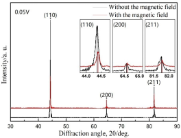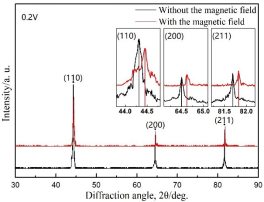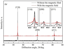 根据XRD的结果(见图3),施加外场后,含V的合金衍射峰发生明显右移。这意味着,BCC晶格参数出现减小(见表1),晶胞发生收缩,即磁致收缩现象,而不含钒的合金是磁滞膨胀的。