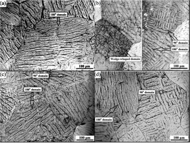 图1. 900℃×1小时退火态Fe-16Cr-2.5Mo合金的磁畴结构. (a) 0V; (b) 0.05V; (c) 0.1V; (d) 0.2V