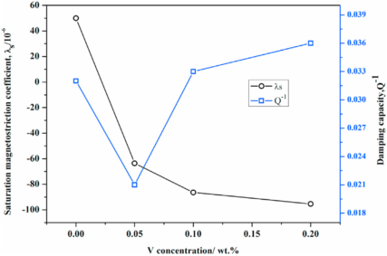 图5. 钒含量对饱和磁致伸缩系数及阻尼性能的影响.