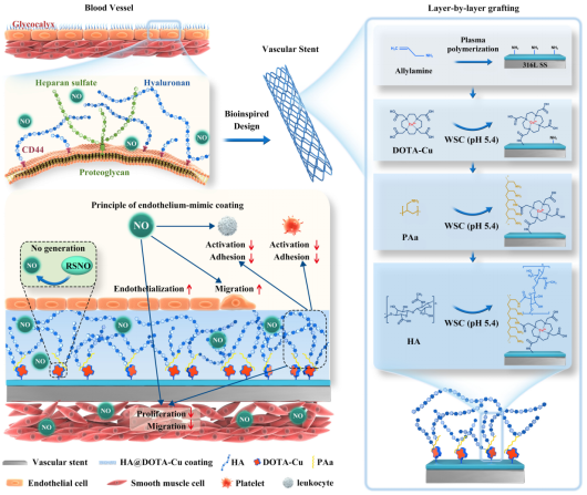最近,韦德官方网站黄楠/杨志禄教授联合江苏大学潘国庆教授,从内皮细胞仿生设计出发,通过层层接枝的方法,构建了一个具有双功能仿生的涂层,用于心血管类支架材料的表面改性,以期解决心长期困扰着心血管支架在长期植入过程中会出现再狭窄和晚期血栓的一个重要临床医学问题(图1)。在这项研究中,NO生成的Cu2+螯合DOTA和典型的糖萼组分透明质酸(HA)通过水连续逐层的固定在等离子聚烯丙胺(PPAm)涂层支架上。逐层接枝策略可以独立控制每个接枝层上的生物分子密度和含量,从而便于在多组分修饰中调整和优化表面功能。具体地说,DOTA单侧的羧基首先被用于与支架上PPAm的氨基偶联,剩下的羧基用于二次接枝。为了获得高的HA接枝密度,进一步利用PAa将羧基转移到多个氨基来放大反应位点。从而得到一个成分可控的且拥有高度内皮仿生的心血管支架涂层。