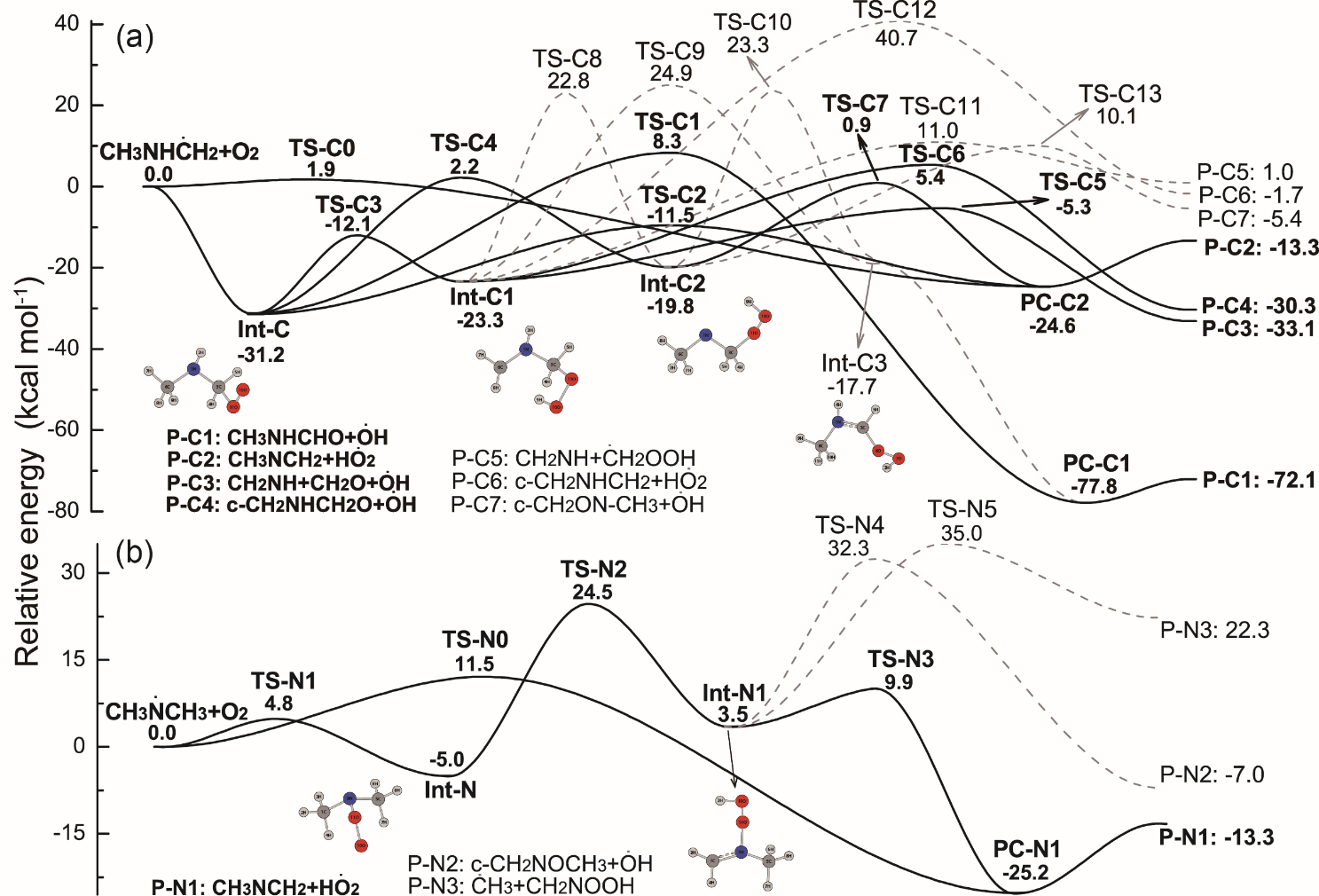 通过对火箭推进剂燃料二甲胺的低温燃烧反应机理的理论研究,我们建立了明显不同于传统的碳氢燃料低温燃烧反应网络(图1),可为系统确立含氮燃料的低温燃烧反应网络提供指导和借鉴。相关成果以“Insight into the low-temperature oxidation of dimethylamine radicals”为题发表在Proceedings of the Combustion Institute上。博士研究生尚艳磊为论文的第一作者,甯红波助理研究员、史进春副研究员为共同通讯作者。
