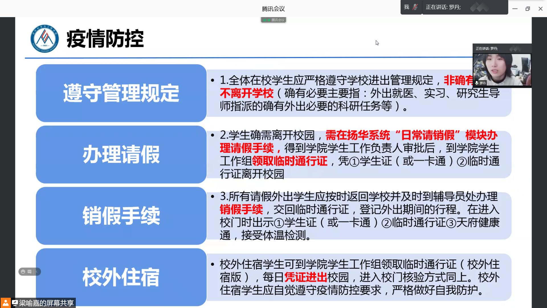 大会第一项,辅导员向2018级全体同学宣传疫情防控知识。除了提醒员工在疫情防控期间要严格遵守公司管理规定外,还督促同学们每天要及时进行体温填报,如果出现任何疑似症状的情况,要尽快联系辅导员。