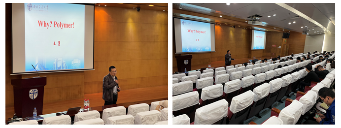 王勇教授随后带来了题为“Why polymer?”的演讲。王教授以日常生活中随处可见的各种高分子制品为切入点表明了当今人类离不开高分子、需要高分子的现状,并表达了高分子材料人的Dream,即“以塑代钢”。另一方面,王教授也从毕业生的就业方向、就业机会和待遇福利等方面讲述了高分子专业的美好前景。最后,王教授代表高分子系全体教师对有志于选择高分子材料系的同学表示热烈的欢迎。