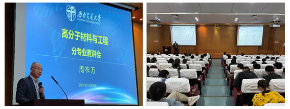 2021年3月28日15:00,2020级本科生专业分流宣讲会——高分子材料与工程专业专场在犀浦校区图书馆一号报告厅举行。2020级材料大类专业本科生参加本次宣讲会。莅临现场的还有周祚万教授、王勇教授、蒋小松教授、郑纪伟老师、韦炜博士。本次宣讲会由高分子系主任孟凡彬主持。