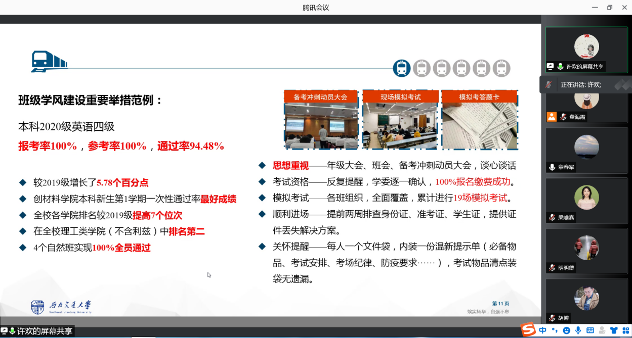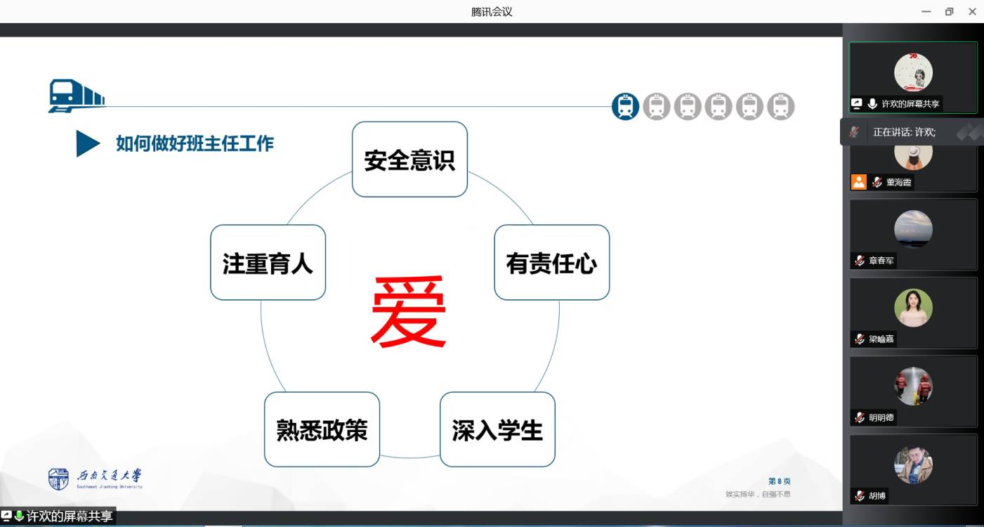 另外,许欢老师还解读了校院两级本科生管理的重要规章制度,确保各位班主任能够了解学籍管理、奖学金评定、新生晚自习等工作制度,并在工作中能高效合理开展工作。许欢老师还向大家介绍了今年的迎新系列活动安排,并结合今年疫情防控常态化工作要求,向老师们讲解了员工发热或疑似症状处置流程、体温每日三测三报、寝室晚点名、请销假等日常管理规定,着重提醒老师们做好疫情防控形势下的员工教育工作,梳理了近期重点工作清单,提醒老师们做好寝室走访、第一次班会等工作。