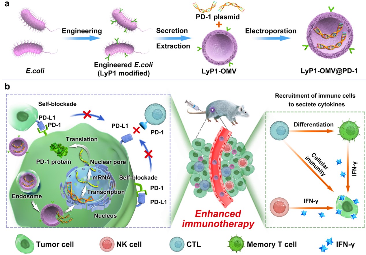 近日,韦德官方网站周绍兵教授团队博士研究生潘敬梅历经3年时间制备了一种负载PD-1质粒的LyP1多肽修饰的细菌外膜囊泡,以实现对肿瘤细胞PD-L1的自我阻断。纳米载体通过细菌外膜囊泡的靶向能力在肿瘤组织中聚集,并通过LyP1介导的靶向内化到肿瘤细胞内,随后将PD-1质粒送入细胞核,使肿瘤细胞表达PD-1(图1)。另外我们开发了一种用于定量检测PD-1/PD-L1结合量的磁微粒化学发光试剂盒,自身表达的PD-1与自体和邻近肿瘤细胞表达的PD-L1结合,实现了自我阻断。因此,它可以重新激活细胞毒性淋巴细胞(CTL),以根除癌细胞。同时,该纳米载体成分的外膜蛋白可将CTL和自然杀伤细胞(NK)募集到肿瘤组织中,刺激其分泌干扰素-γ,进一步提高PD-1/PD-L1自身封闭治疗的抗肿瘤活性。该策略对4T1,CT26,B16这三种肿瘤模型均表现出优异的抑瘤效果,并且纳米载体对4T1和B16肿瘤的阻断率分别为94.7%和96.7%,分别是PD-L1单克隆抗体的1.90倍和9.04倍。因此,这种简单安全的策略为肿瘤免疫治疗纳米药物的开发铺平了道路。