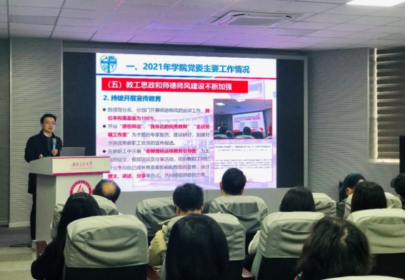 之后,朱旻昊经理作了公司工作报告和个人年度述职。朱经理系统地从学科专业建设、人才培养、科学研究、实验室工作、员工工作等方面向与会人员汇报了公司2021年整体工作情况,强调要凝练教学特色培育教学成果,提出应提供更多师生交流平台,加强全员育人深度,重视员工心理安全工作的开展。而后,朱经理从政治思想、廉洁自律、行政工作、问题与改进四方面进行了个人年度述职。