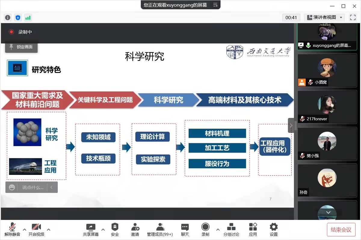 2022年3月26日晚19:00,材料科学与工程专业(金属及无机非金属方向)分流宣讲会在腾讯会议线上平台顺利举办。本次宣讲会由金材系主任樊小强老师主持,参加本次线上宣讲会的嘉宾有:中国人民解放军第五七一九工厂项目主管郭双全员工,共青团重庆市委员会四级主任科员、重庆市北碚区柳荫镇永兴村党支部书记助理孙越员工,金属/无机非方向专业的教师朱旻昊、胥永刚、李琦、冯庆国、孙奇、马新凯、刘佃光等,优秀学长韦骁峰(2016级金属材料专业免研),刘长宝(2016级材料科学与工程茅班),黄宇(2016级金属材料考研390分),金灵(2017级无机非方向免研)等。