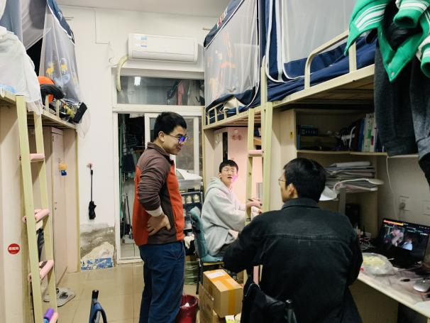 20:00,2018级毕业班辅导员梁喻嘉、黄德明一起到达天佑斋17栋看看即将毕业的同学们,这已经两位辅导员老师本学期第21次前往员工宿舍,针对员工考研复试调剂、就业签约、宿舍安全等工作,开展一对一指导帮扶。梁老师在确定被录取为研究生的人数达到150人,较去年增长超过15人、比例将至少提升4%后,激动地在朋友圈记录2018级同学们的收获。