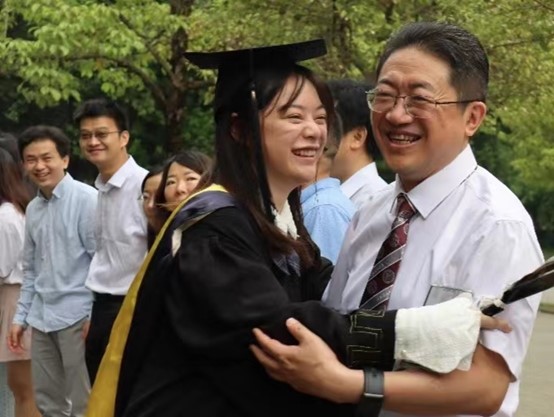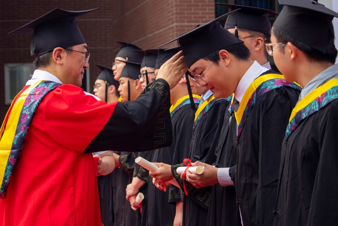 毕业典礼环节结束,授位仪式正式开始。授位仪式神圣而庄严,标志着老员工活圆满结束。拨穗正冠,代表稻穗或麦穗成熟,象征学子们已学有所成,即将展翅高飞,同时也寓意学子们在岁月的征程中行稳致远。同学们身着学士服依次上台,bevictor伟德官网院长、学位评定分委员会主席、主礼教授朱旻昊为他们逐一拔穗, 200多名毕业生,200多次握手,200多次拨穗,每一个瞬间都将定格,在记忆的长河里熠熠生辉。