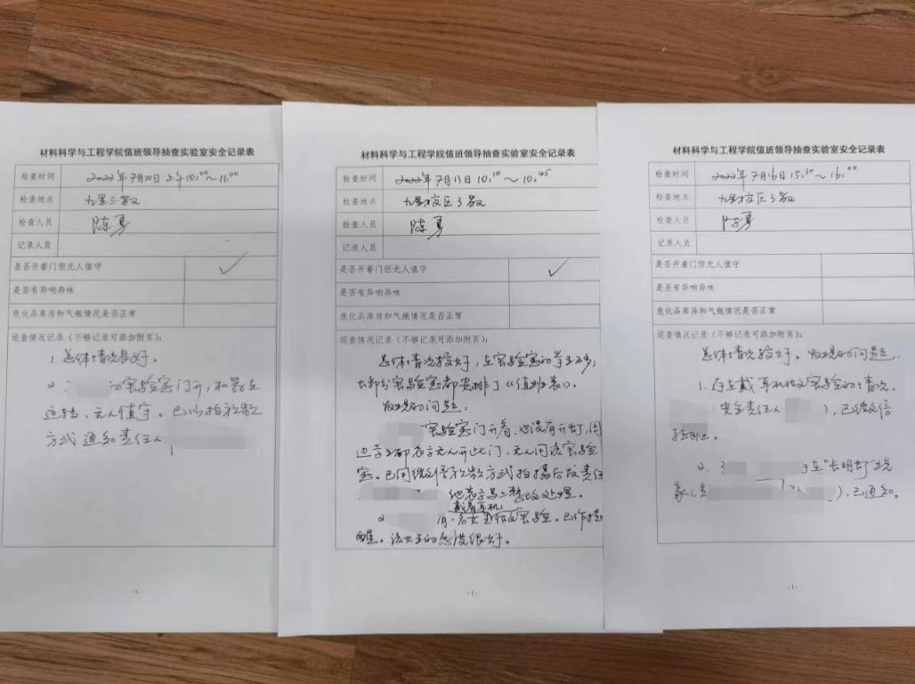 七月巡查(7月11日-30日)情况显示,各实验室整体情况良好,依然保持着前期积累的安全工作成效:1)安全记录工作受到普遍重视; 2)管制试剂或药品,绝大部分实验室严格落实双人双锁的管理要求。