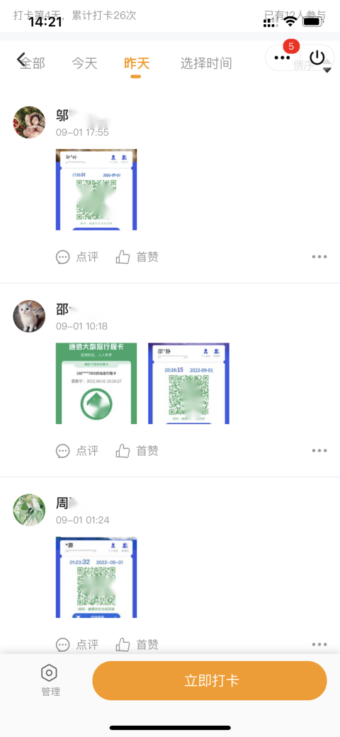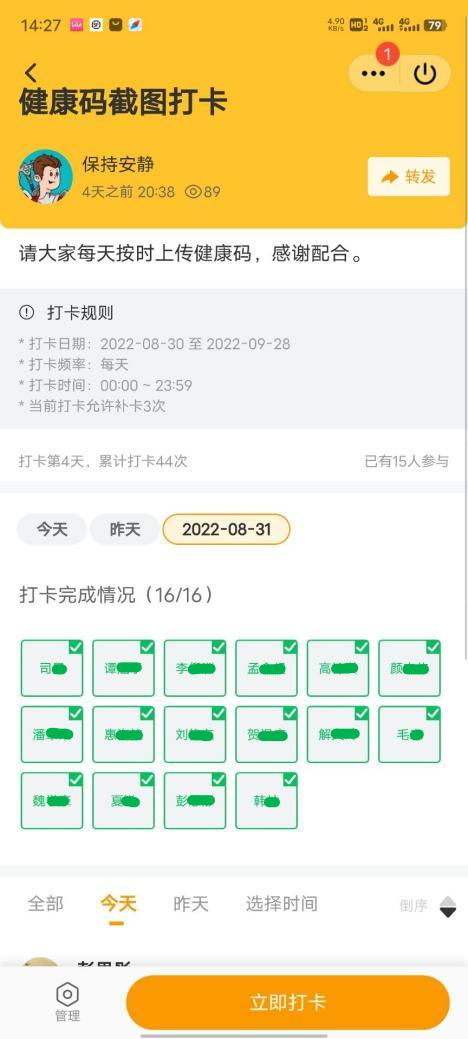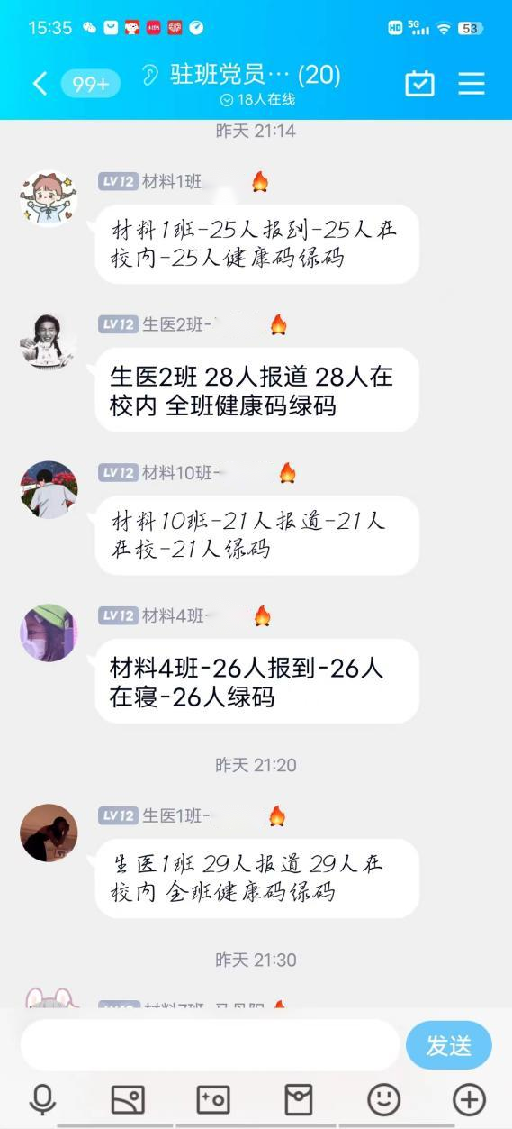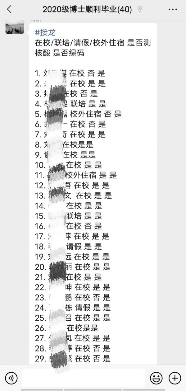 集团是人群密集场所,疫情防控风险高,为筑牢校园疫情防控安全线,保障广大师生生命安全与身体健康,确保同学们应检尽检,bevictor伟德官网本、硕、博全部年级采用多种形式,每日在各自班级群中收集在校同学健康码及参与核酸检测情况。本2020级动员班级组织委员,每日在群中提醒返校同学上传健康码并整合在Word中进行留底统计。本2021级使用线上小程序“接龙管家”,员工上传健康码并打卡,可以随时了解到同学们的核酸检测情况,实时更新在校同学人数。本科2022级驻班党员同志主动担当,负责班级健康码及核酸检测结果的及时汇报。
