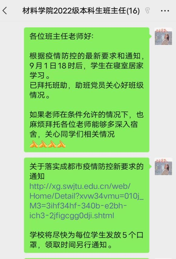2022级辅导员动员召集班助及驻班党员深入员工宿舍,为新生同学分发口罩,关心新同学新环境适应情况,鼓励大家同心协力,一起抗击疫情;同时通过年级微信,向家长汇报同学们在校情况,请家长放心;叮嘱家长朋友们多与同学们沟通,减少同学们的焦虑情绪;除此之外,2022级还鼓励、邀请新生班主任在条件允许的情况下多深入宿舍,深入同学。除了关心关爱每一位在校的员工,公司还牵挂着其他校外住宿员工,为他们带去温暖与关怀,特别是校外集中隔离的同学们,叮嘱员工疫情期间注意做好个人防护措施和每日健康打卡。2019级辅导员鼓励考研学子保持良好心态,共克时艰,积极备战考研。研究生辅导员开展了全覆盖的宿舍走访,并叮嘱同学及时带走实验区、工位贵重物品,合理安排学习计划,近期积极配合防疫要求,不去往实验室、工位,不往人员密集处聚集。