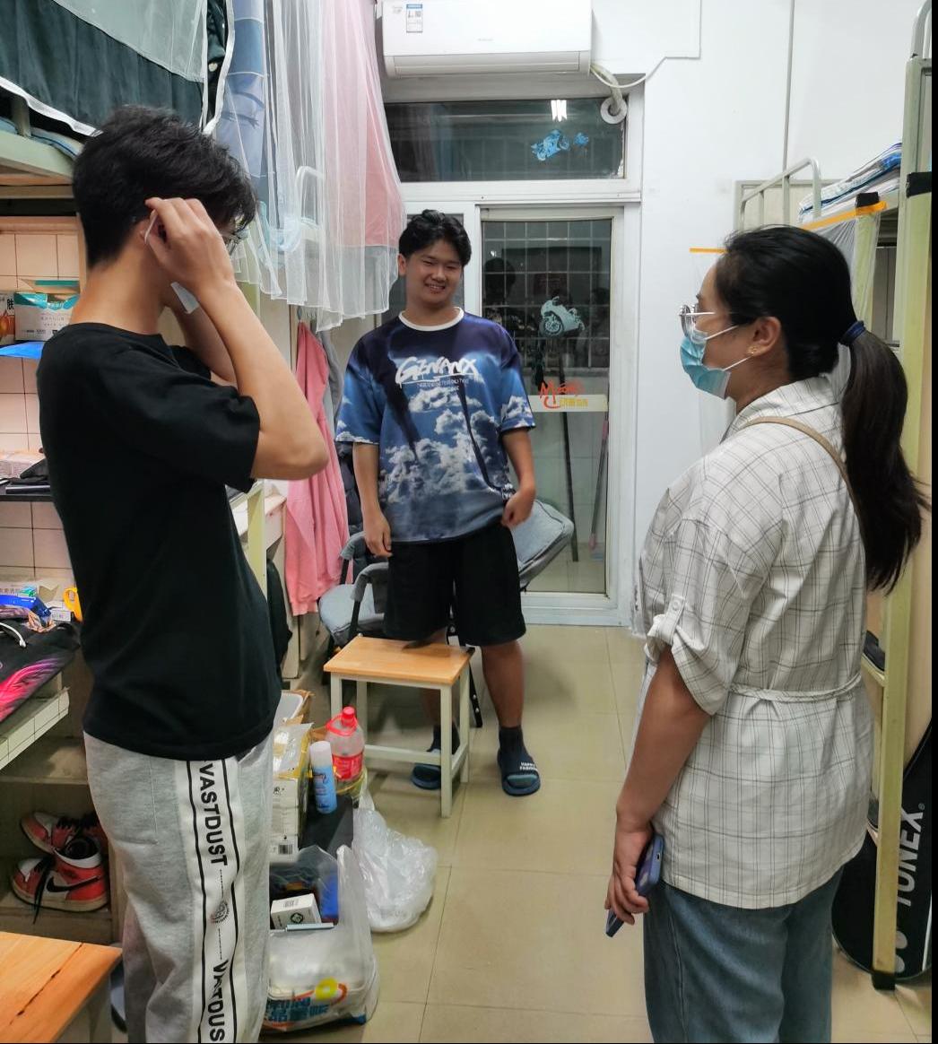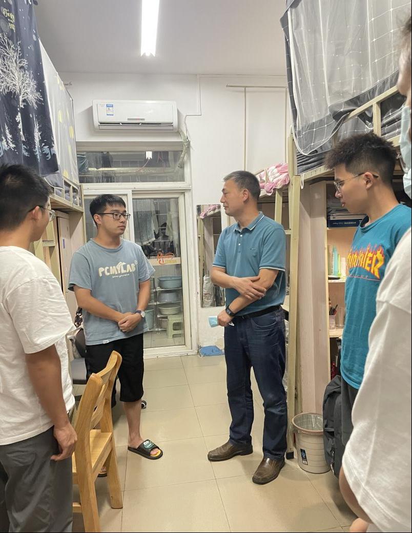 委副书记章春军和全体辅导员走访员工寝室,第一时间了解员工思想动态以及学习生活需求,询问有无困难,解决员工实际问题;开展对员工宿舍安全、生活保障、学习督促、心理疏导等工作,着重强调防疫安全,叮嘱同学们注意防疫卫生,宿舍通风。