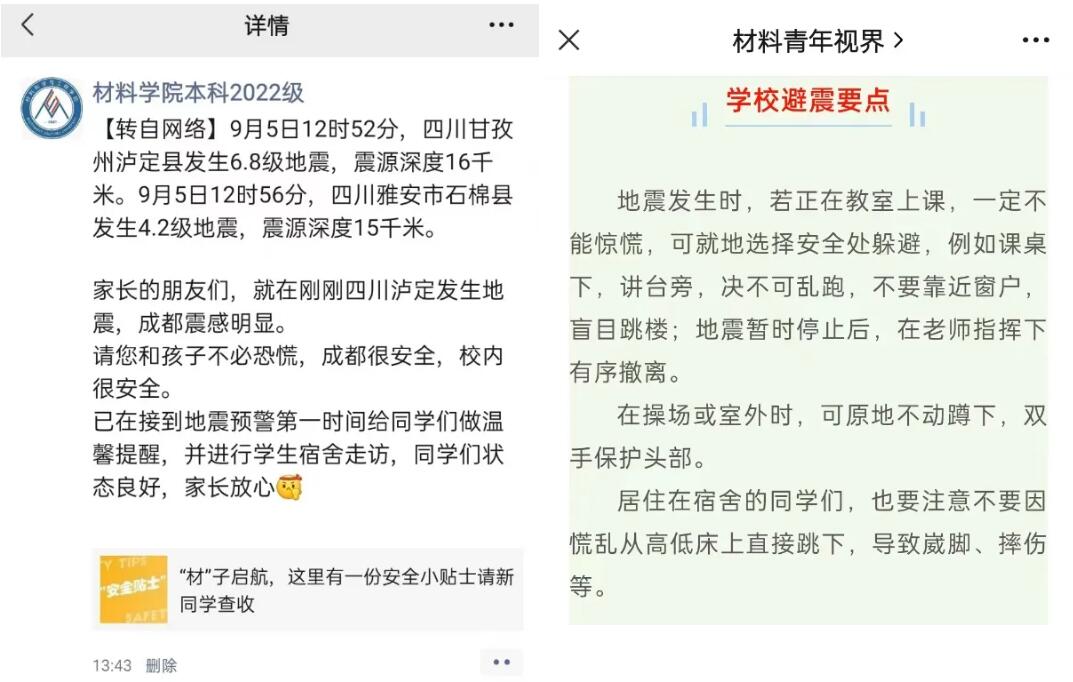 9月5日中午,甘孜泸定发生6.8级地震,公司震感明显。公司党委陈勇书记第一时间要求关注在校员工特别是新生的情况,了解是否有员工家中受灾。学工组全体辅导员老师第一时间前往员工寝室查看情况。不少新生第一次经历地震,但很快平复情绪,表示之前在公司微信推送的“新生安全小贴士”中了解到成都常有震感,还是做了些心理准备,只是没想到这么快就碰到地震了。当日下午,公司微信公众号推送《地震科普小知识》,为同学们送上地震防震常识。中秋前夕,陈勇书记专程在走访新生公寓时,还专门询问了同学们地震中的感受,结合自身经历告诉同学们在交大学习不要担心地震。