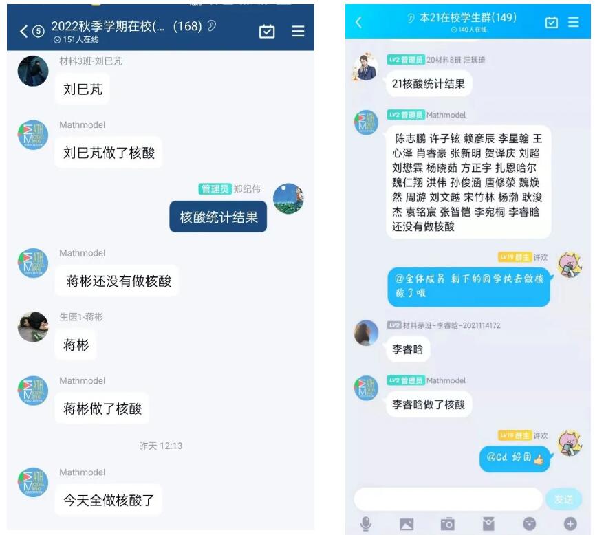员工工作组以“四个重点”为牵引,多措并举抓好抓防疫工作要求落实情况。一是抓宣贯教育。通过线上各类会议、各类员工QQ群、走访寝室等多种渠道加强防疫规定宣传,确保员工人人知晓;在公司官网和官方微信平台发布《疫情防控期间员工违规违纪警示案例》和《违法违规行为及法律后果》,实现警示教育目的。二是核酸检测力争不漏一人。每日全员核酸检测工作,年级辅导员必到检测现场带队组织和了解情况;对照在校生名单,逐一核实是否检测;为做好该项工作,本科2020级采用编程技术建立QQ群核酸检测情况统计机器人,实现员工参加核酸检情况统计提质增效,并在各年级和其他公司推广。三是发挥党员和干部在防疫工作的作用。本研各年级充分动员在校员工党员干部主动担当作为,确立班级负责人,担任信息员,协助辅导员做好核酸检测组织、信息统计等相关工作。四是做好员工健康信息管理和核验工作。坚持每日执行体温监测和异常情况报告制度,每日通过钉钉、腾讯在线文档或QQ群等各类途径做好健康码监测,及时统计和核验全体在校生的核酸检测结果信息,及时发现黄红码、核酸结果缺失等异常信息并做好妥善处理。