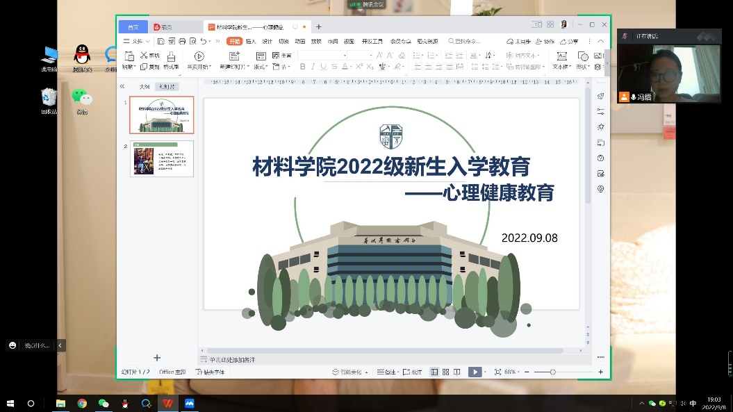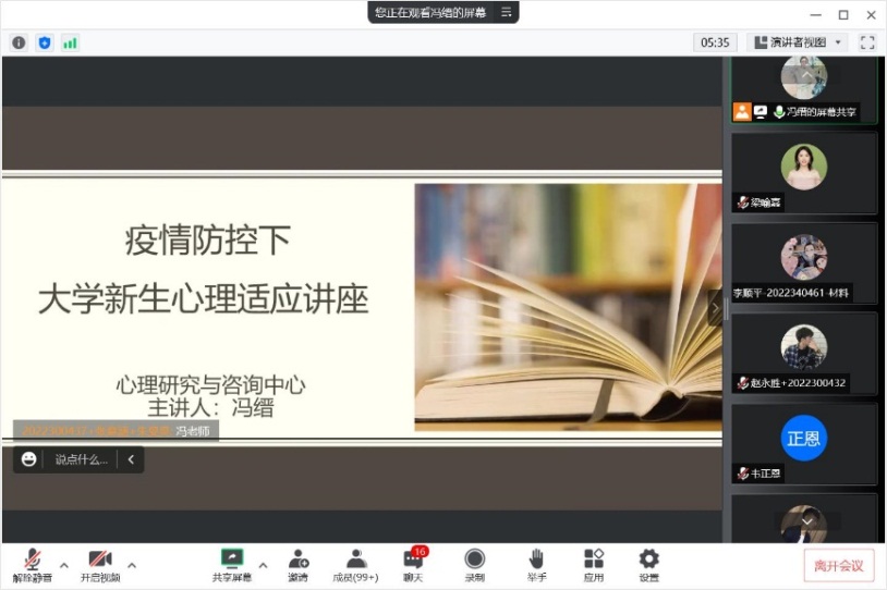 目前,成都疫情防控形势严峻,为帮助同学们缓解紧张焦虑等情绪,积极应对疫情挑战,适应新阶段的校园学习和生活,拥有一个良好、积极、健康的心态,更好地向新的人生角色进行转变。在2022年9月8日晚上19:00点,公司特邀韦德官方网站心理研究与咨询中心的冯缙副教授主讲,开展了主题为“新冠肺炎疫情下新生心理适应线上讲座”。受新冠肺炎疫情的影响,本次讲座采用线上的形式,在腾讯会议上进行,全体2022级研究生新生参会。